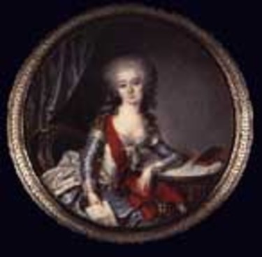 called the Chanoisesse de Golmin, full face in white satin dress with blue silk underskirt and sleeves, long powdered curling hair upswept, wearing the red moiré silk sash, cross of an order and gold epaulette, seated in a blue upholstered gilt-wood chair, holding a latter in her right hand and her left arm resting on a table with a marble top, maroon covered book beside her, blue silk curtain background, silver frame stamped with a coin pattern Christie's London. An excellent bid for a miniature not formerly given to Hallé. It carried a pre-sale estimate of between £ 7,000 to 9,000. Little is known about this artist who was the nephew of the painter Gabriel Briard. He also been often confused with Noël Hallé (1711-1781) regarding miniatures produced between 1775 and 1780. |