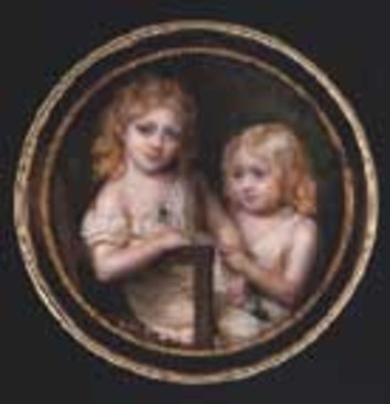 the elder in green bordered loose white dress with green ribbon bow and long curling fair hair, seated on a wooden chair strewn with pink roses and leaves and pink roses and leaves on her lap, the younger girl holding her sister's arm, in sleeveless white robe and long fair hair, foliate background, gouache on ivory, gold mount, set on the cover of a composition bonbonniere Christie's London. A strong bid for such an exquisite miniature but explainable by the fact that portraits of children are much sought by amateurs. This miniature carried a pre-sale estimate of between £ 6,000 and 8,000. Laurent was born in Baccarat and was like Augustin a pupil of Claudot in Nancy. He then went to Paris and made his debut at the Salon of 1791 and continued to exhibit until 1831. This artists counts amongst the best French miniaturists of the 18th and the beginning of the 19th Century, faultless in drawing and in expression with an exceptional sense of colour. His miniatures were composed with much care and art and offered a great variety of poses. His works were true pictures with a virtuosity and a perfect light and often included landscape backgrounds painted with much skill. |